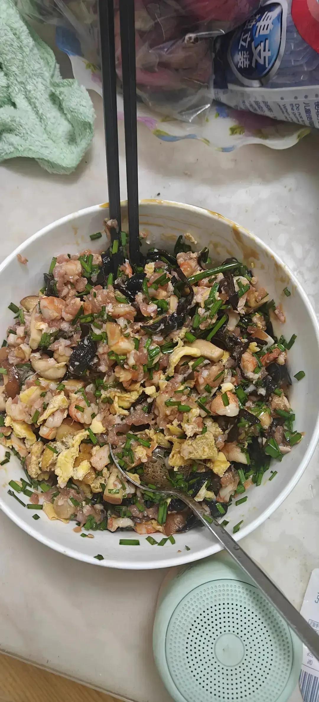 韭菜80克  500克虾剥壳  300克猪肉馅 五颗香菇和黑木耳  三勺生抽,五勺蚝油,五勺料酒  30克油(太多了难包)
