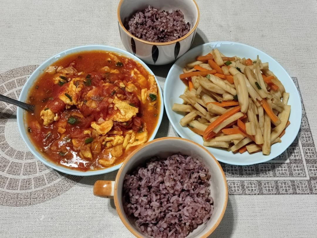 藕丝炒胡萝卜丝,番茄炒蛋,杂粮饭