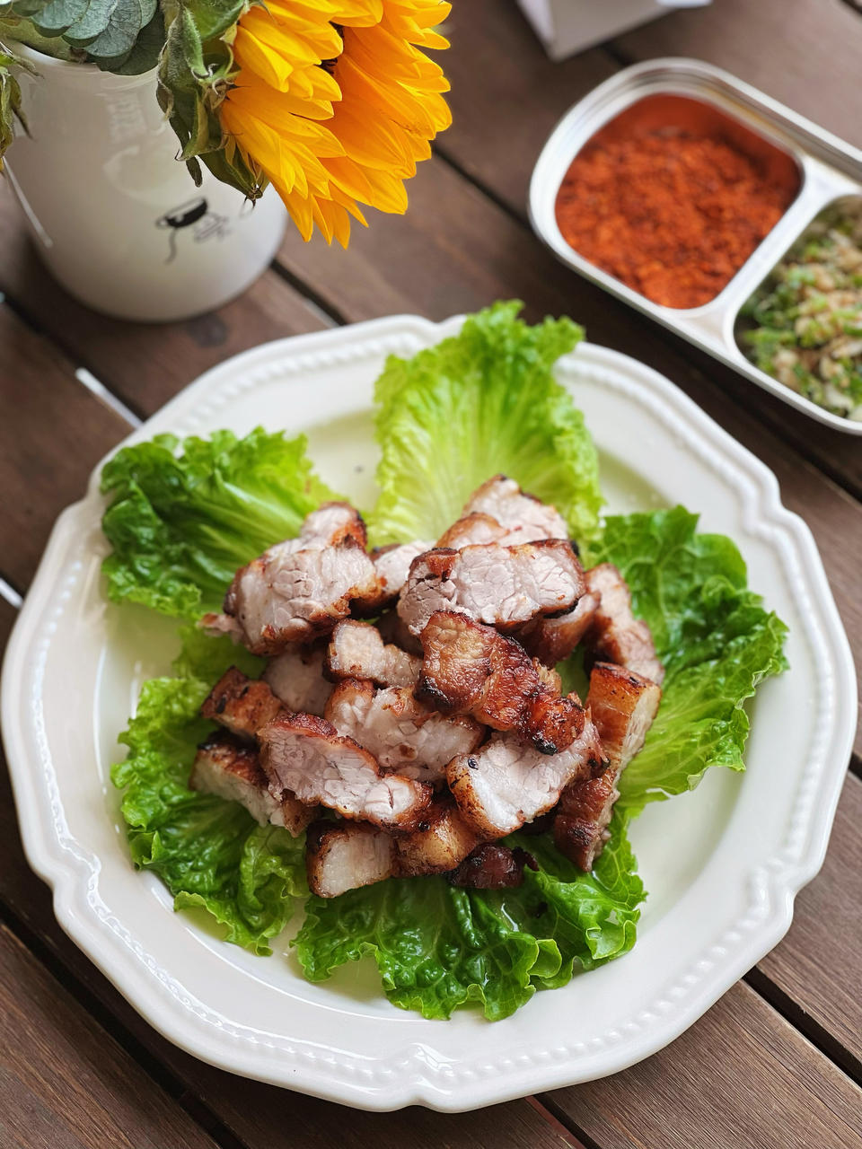 梅之小榭 做过 2025年08月25日 水煎五花肉:去皮五花肉冲洗干净放入锅中,加水差不多盖住肉,加姜片、葱白、料酒煮开,撇去浮沫加盖转中火煮至水变少,把葱姜挑岀来,加盐和白胡椒粉调味,再煮一会把水熬干,这时候转中小火把肉所有的面都煎至金黄就可以了;葱花、蒜蓉、姜末、芝麻盐、芝麻香油、柠檬混合拌匀,还有烧烤蘸料,都可以配五花肉吃。 08-25