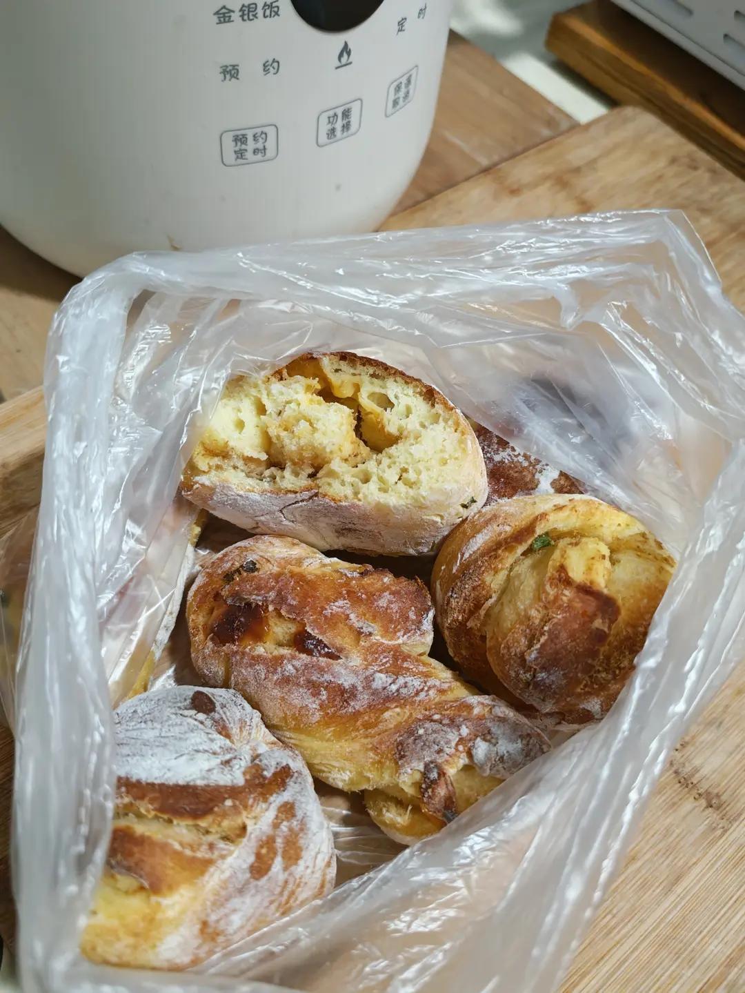 宝不喝的奶粉100毫升多然后加一个鸡蛋加酵母加高筋面粉,厚厚黏糊状,醒半小时手蘸水折叠一次,醒15分钟折叠一次,醒20分钟加面粉杆平,加一点油,加盐 葱花 自制肉松 芝士片,然后卷起来,塑形 扭一扭 盘一盘,应该二次发酵20分钟的,忘记了,直接里面放了一小盘水 入烤箱了,190度16 17分钟,因为个头比较小,烤的时间缩短了,口味口感都很不错,就是少了二次发酵,要不然可能会更蓬松