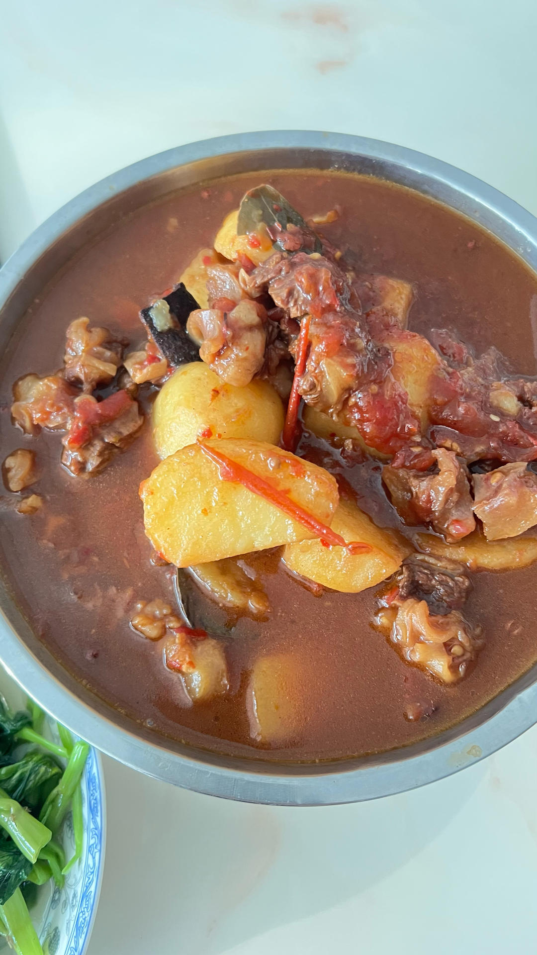 红烧牛腩、凉拌菜、蒜末空心菜、紫菜蛋花汤