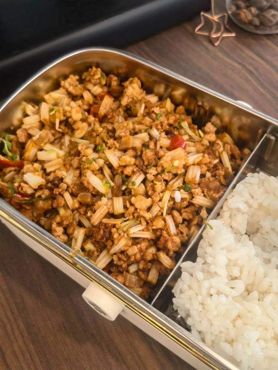 Babytiger 做过 午餐•2025年8月31日 #午餐•2025年8月31日# #妈妈的味道妈妈的爱♥️# 原图,妈妈炒的芹菜肉沫。我感觉如果要继续用这个饭盒带饭,最好是只装菜。主食可以全部换成粗粮,比如蒸的紫薯、红薯、玉米,甚至土豆也可以。 08-31