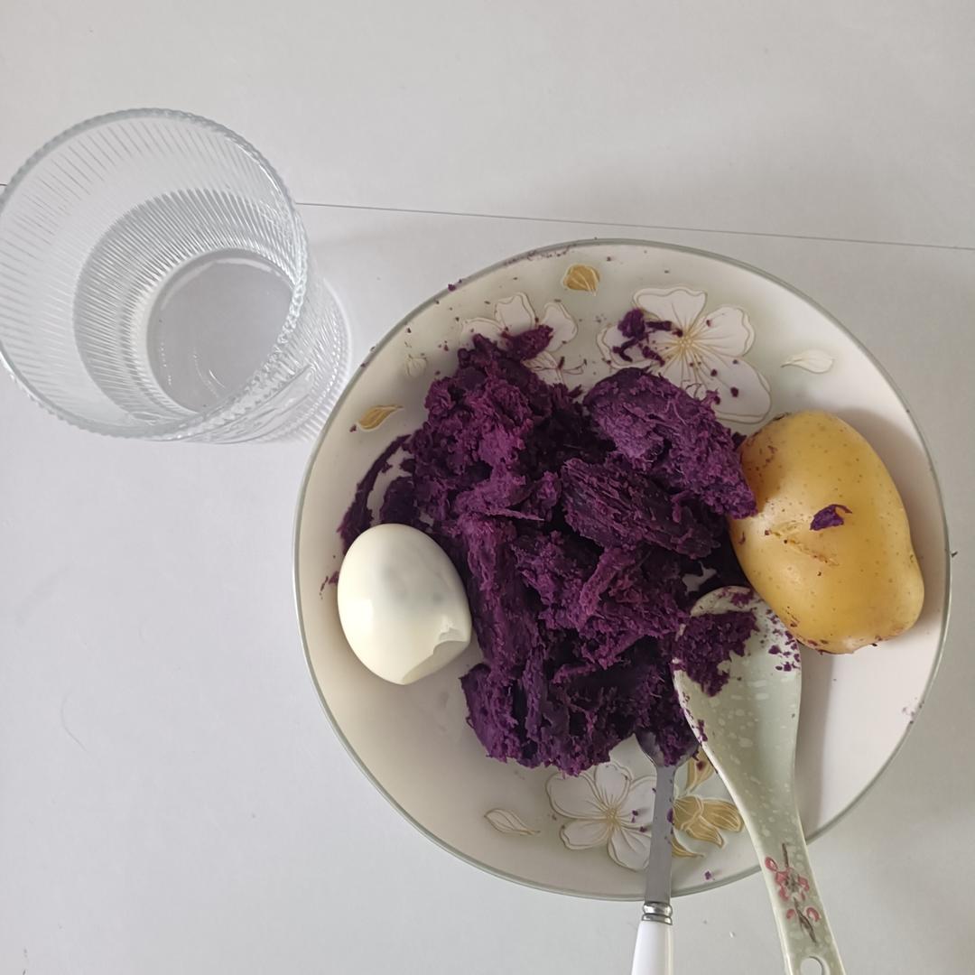 蒸紫薯+土豆,煮的鸡蛋,外加一杯清水