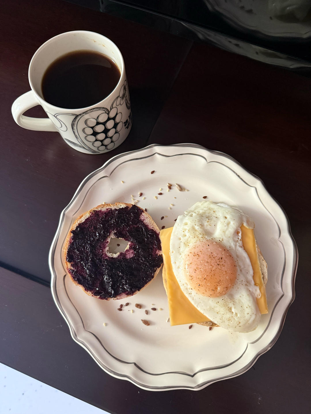 贝果,一半蓝莓酱,一半芝士加蛋