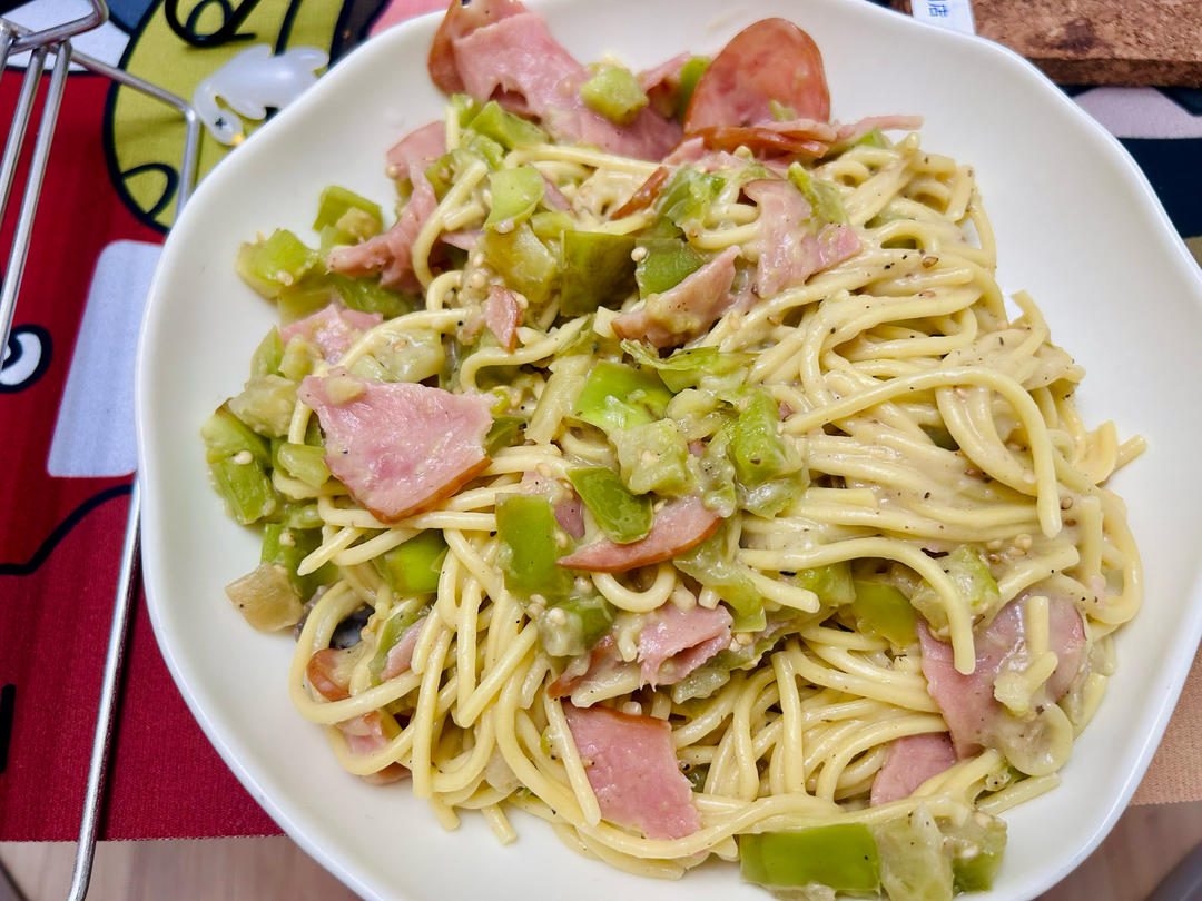奶油蘑菇意面+青茄子、培根😍