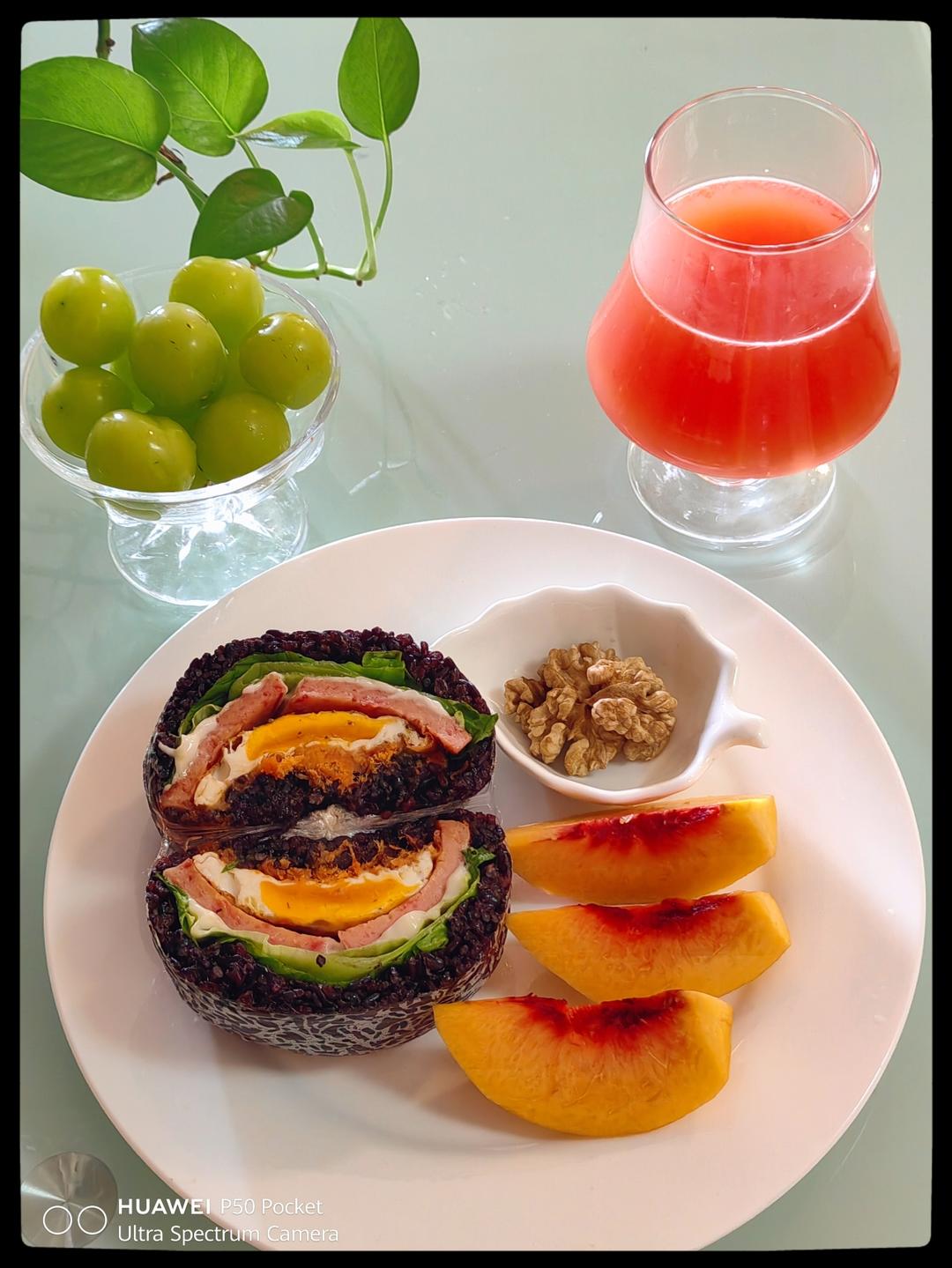 紫米饭团,黄桃,葡萄,蕃茄汁