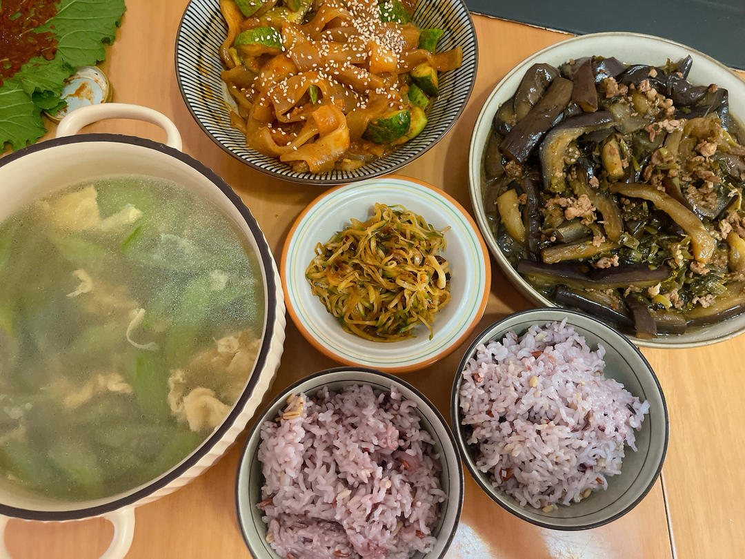 肉沫茄条、麻酱粉皮黄瓜、丝瓜蛋汤、萝卜丝小咸菜、杂粮饭