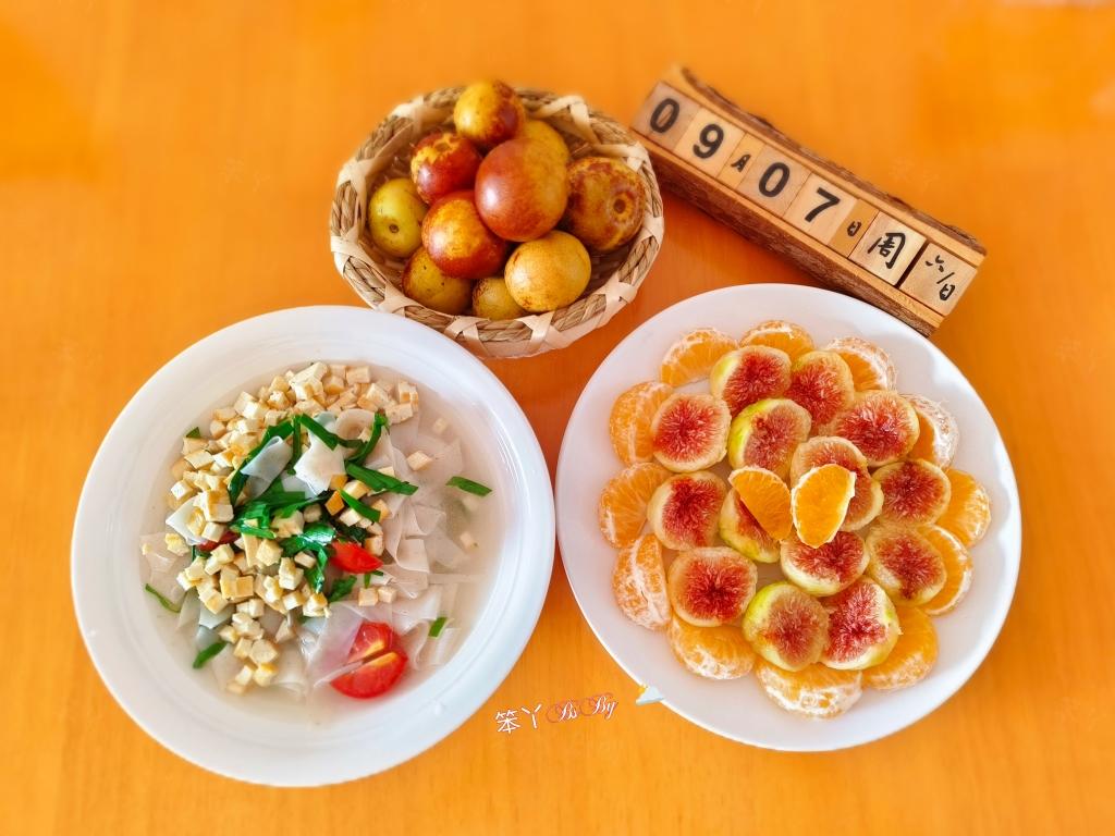 自己的早餐任性的简单:韭菜豆腐丁豇豆汤,某小的早餐是水果~