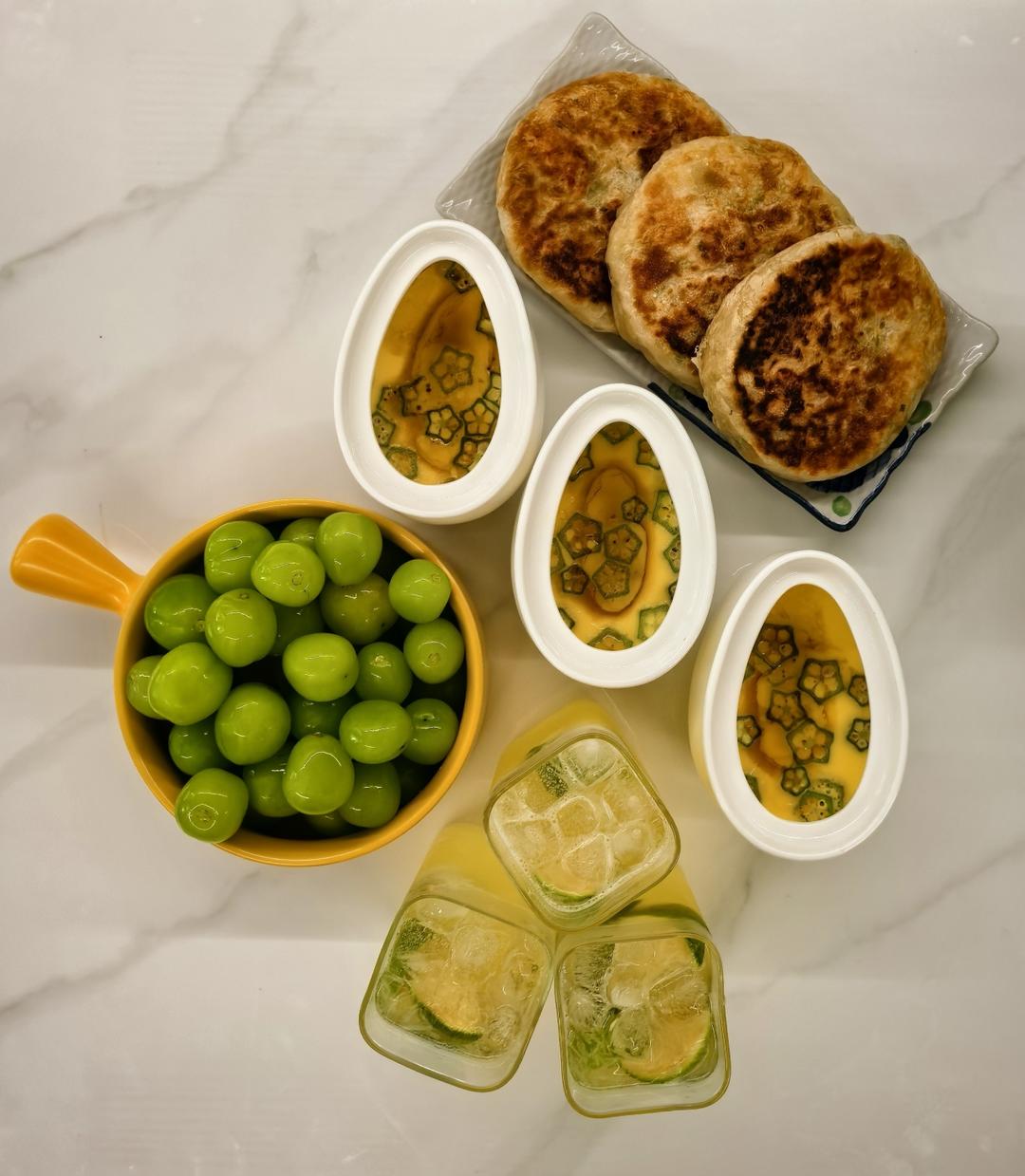 第3042餐:香椰柠檬水、青椒鸡肉饼、秋葵蒸蛋、阳光玫瑰!