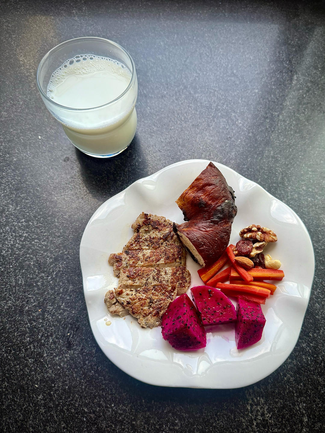 巧克力贝果➕牛排🥩➕红萝卜🥕➕火龙果➕牛奶