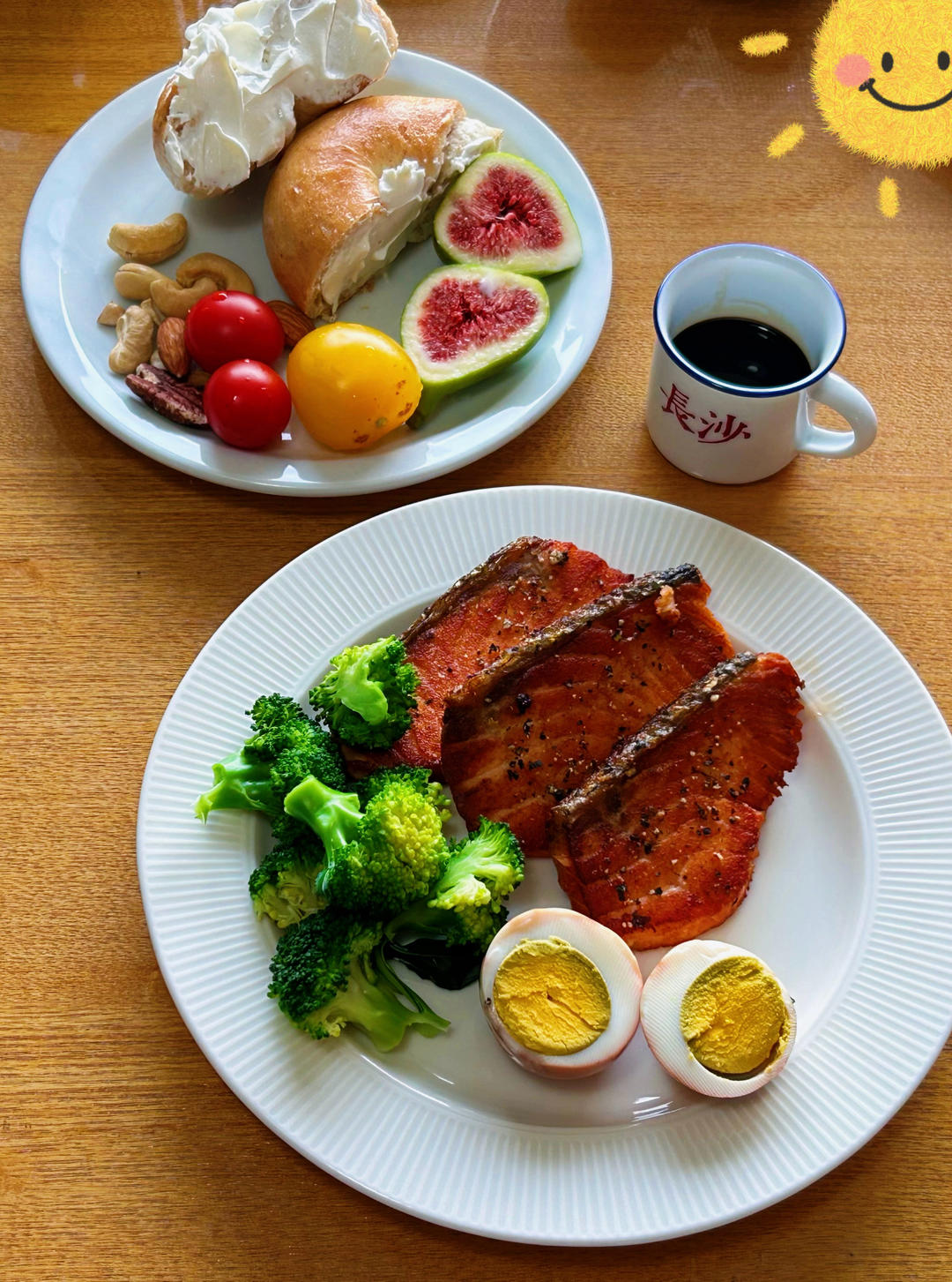 香煎三文鱼、水煮西蓝花,首乌蛋,坚果,无花果,贝果,彩色圣女果,涂抹奶酪,老陈醋