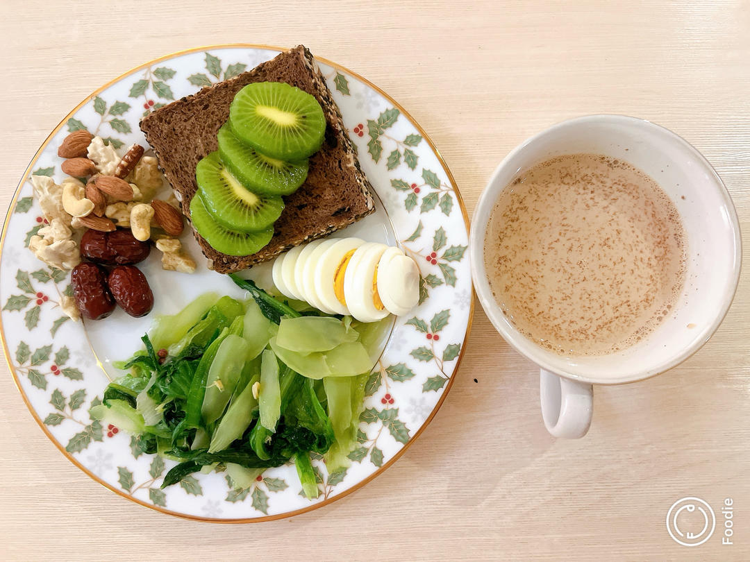 #早餐•2025年9月14日# #好好吃饭,好好生活# 无糖肉桂奶茶➕全麦巧克力吐司,鸡蛋➕坚果,水果➕蔬菜。临时起意做了简单粗暴版无糖奶茶:牛奶➕两袋红茶末搅拌均匀后微波炉加热,放置几分钟让红茶味更浓郁一点,过滤后加入肉桂粉搅拌均匀。