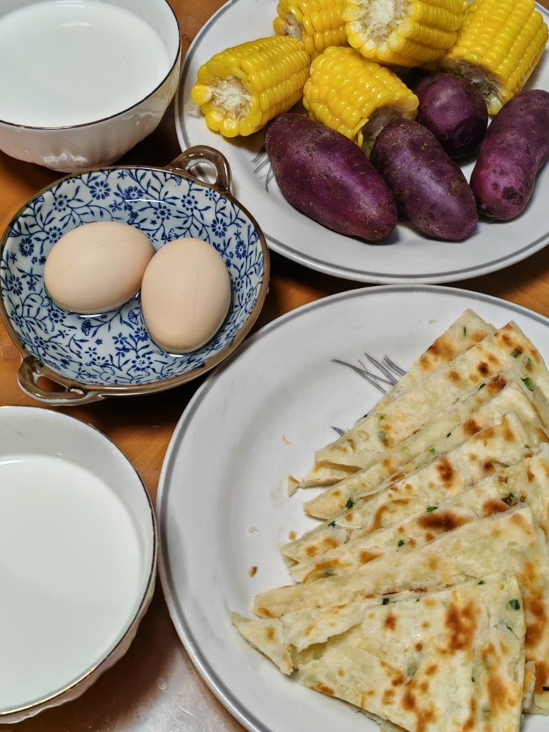 早餐做了葱油饼、水煮蛋、蒸了玉米和紫薯,调皮的小宝又要吃蛋饼!这早餐!