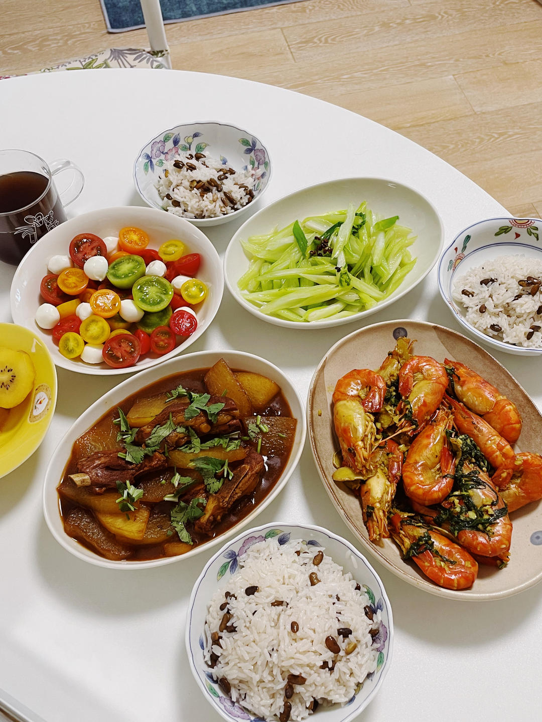 开饭啦,紫苏咖喱罗氏虾,冬瓜炖排骨,素炒芹菜,番茄沙拉
