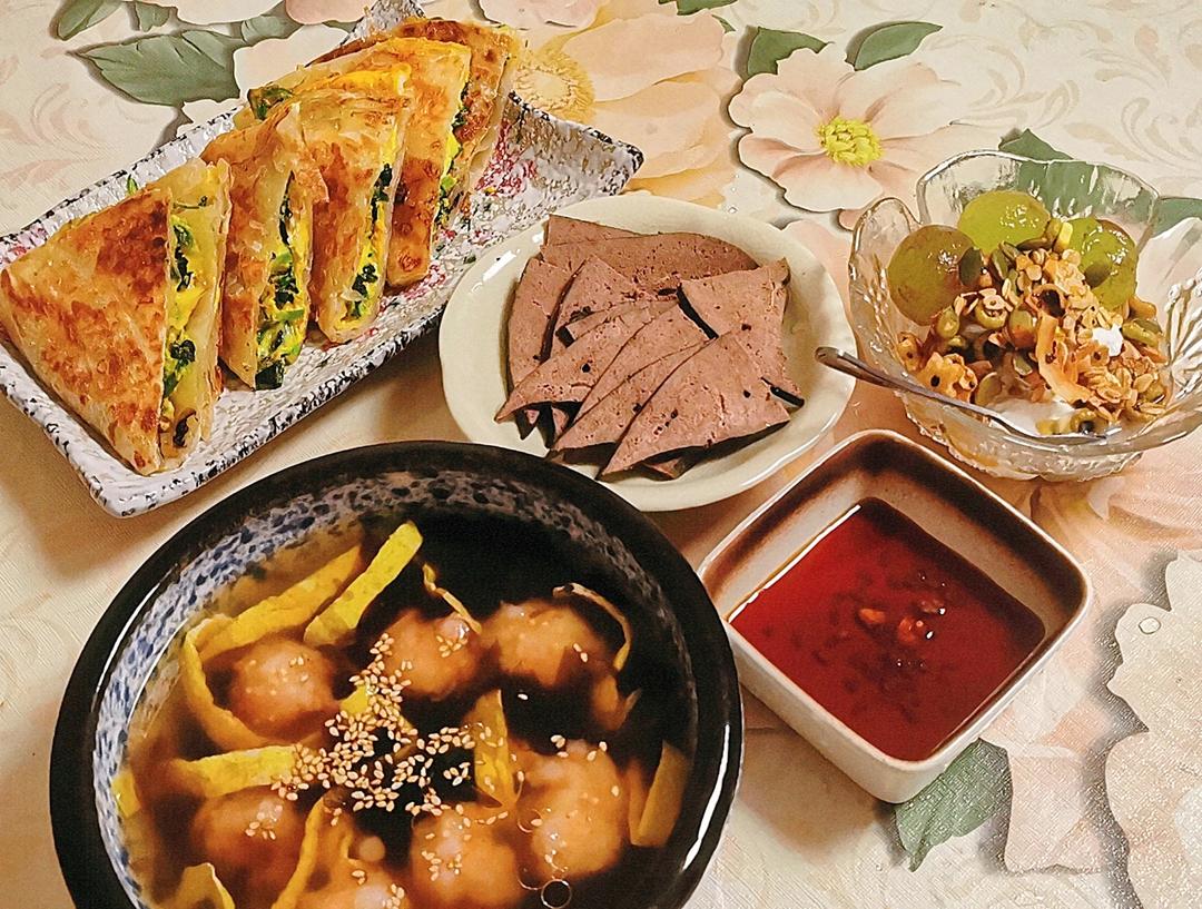 菠菜芝士饼+虾滑紫菜汤+卤猪肝