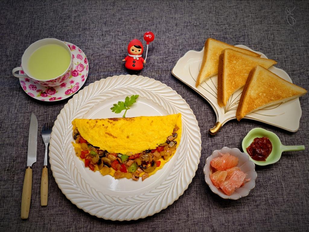 闺女的早餐:欧姆雷特蛋(青椒、红椒、黄椒、口蘑、火腿、洋葱)🥚,烤面包配草莓果酱🍞,柚子🍊,哈密瓜汁🍹