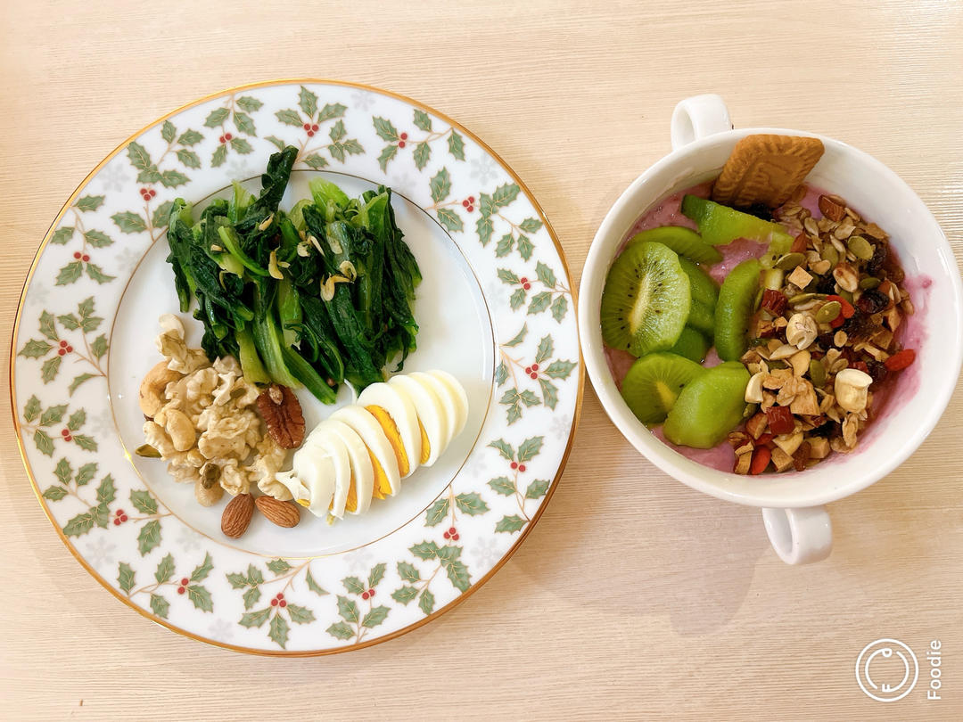 紫薯酸奶碗,鸡蛋➕坚果,蔬菜