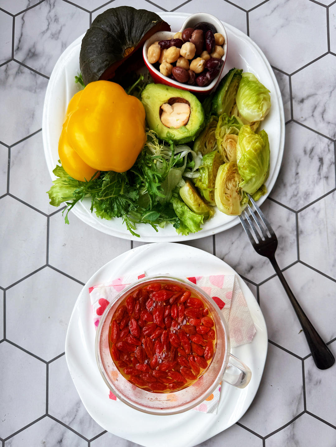 工作日早餐:杂蔬+彩椒+牛油果+花椰菜心+杂豆+南瓜+枸杞水。