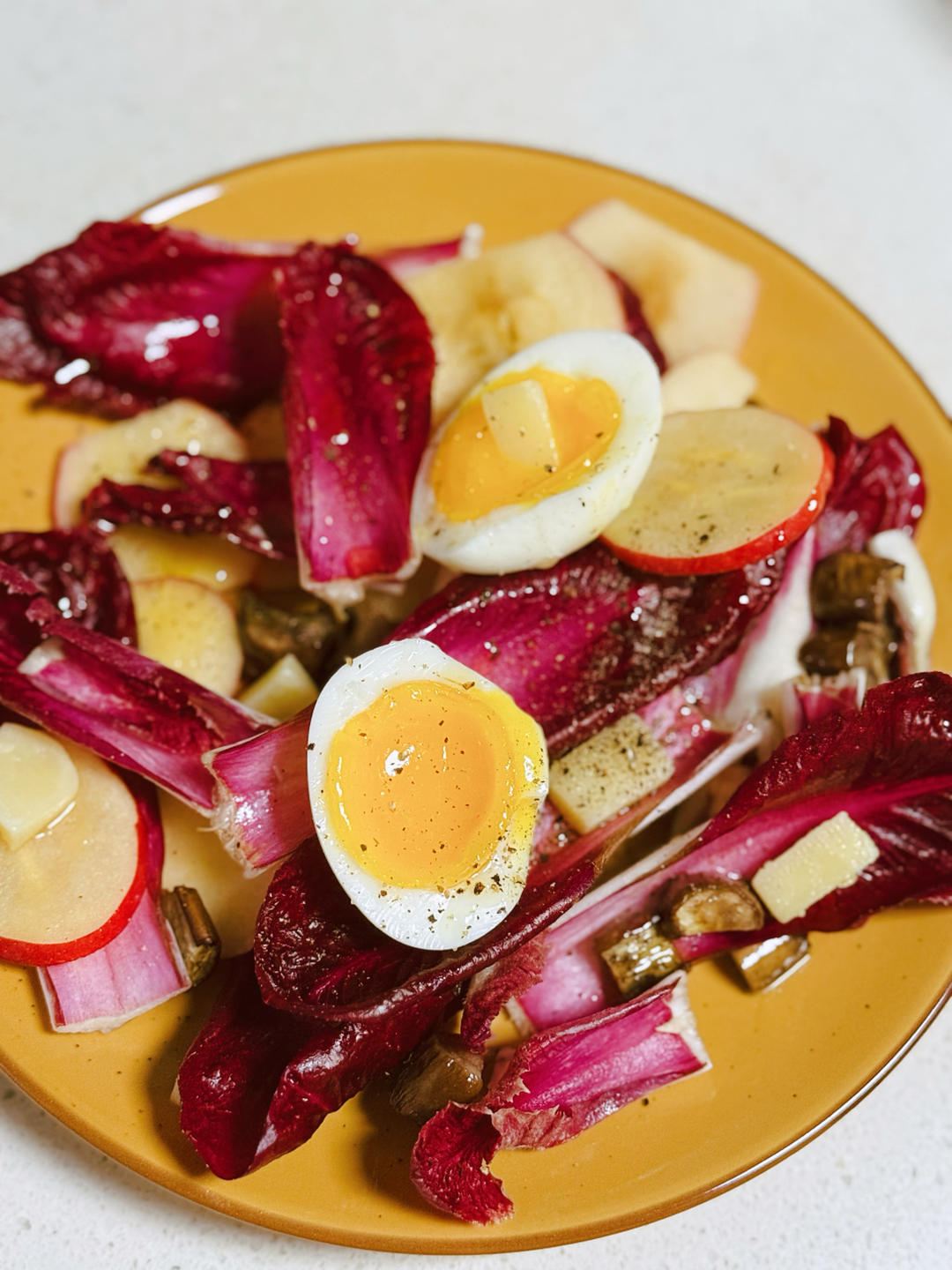 #早餐•2025年9月21日#今天用熟成24月的孔泰奶酪搭配欧洲菊苣做沙拉,还放了烤茄子丁和海棠果!淋一层橄榄油、盐和黑胡椒就可以了。