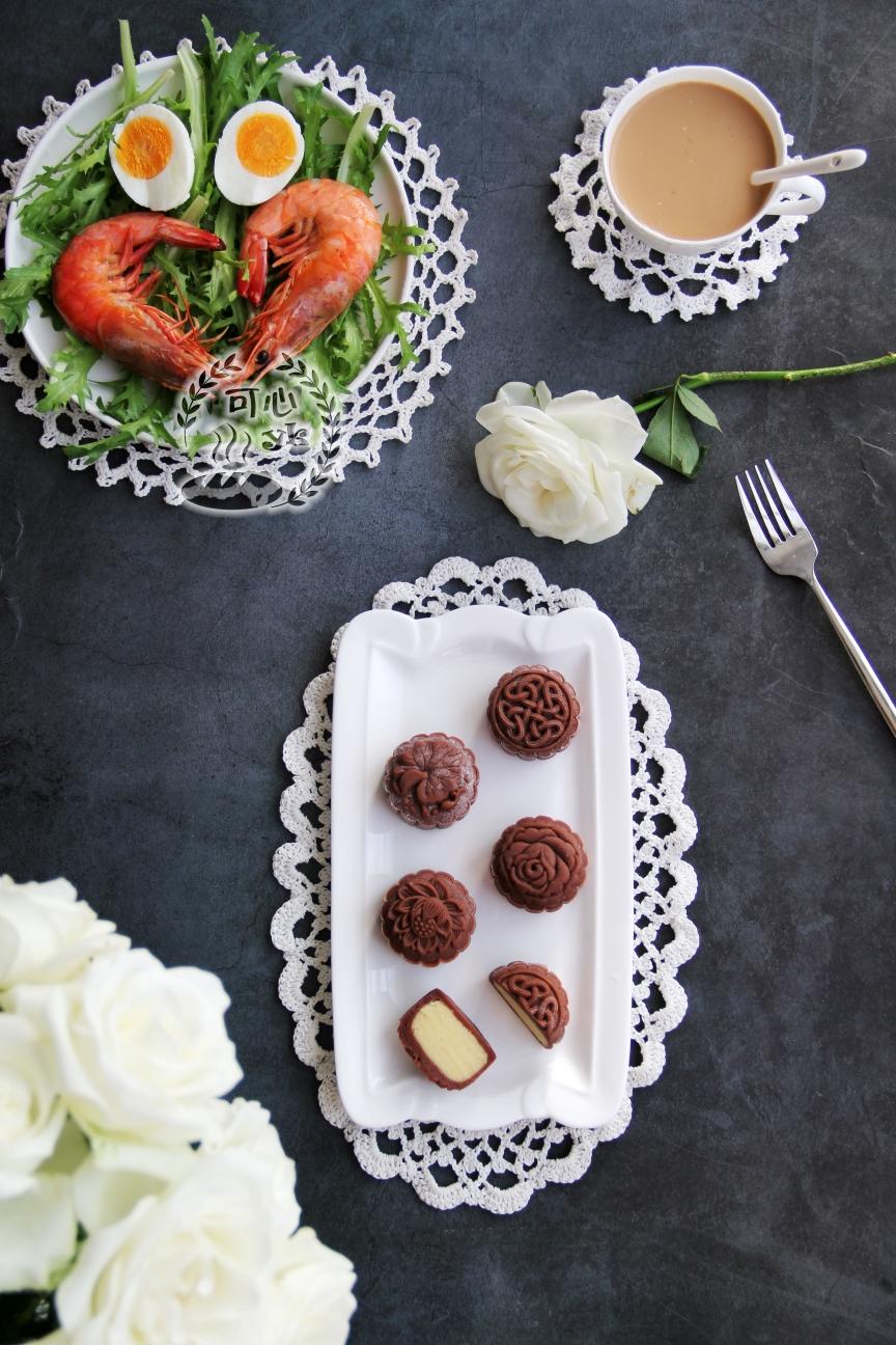 [调皮]今天的早餐:可可绿豆冰皮月饼,虾,鸡蛋,苦苣,咖啡。