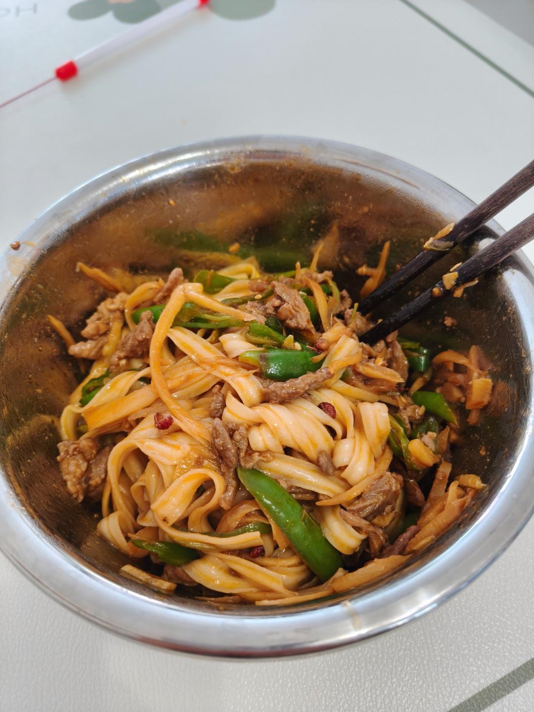 青椒仔姜肉丝拌面