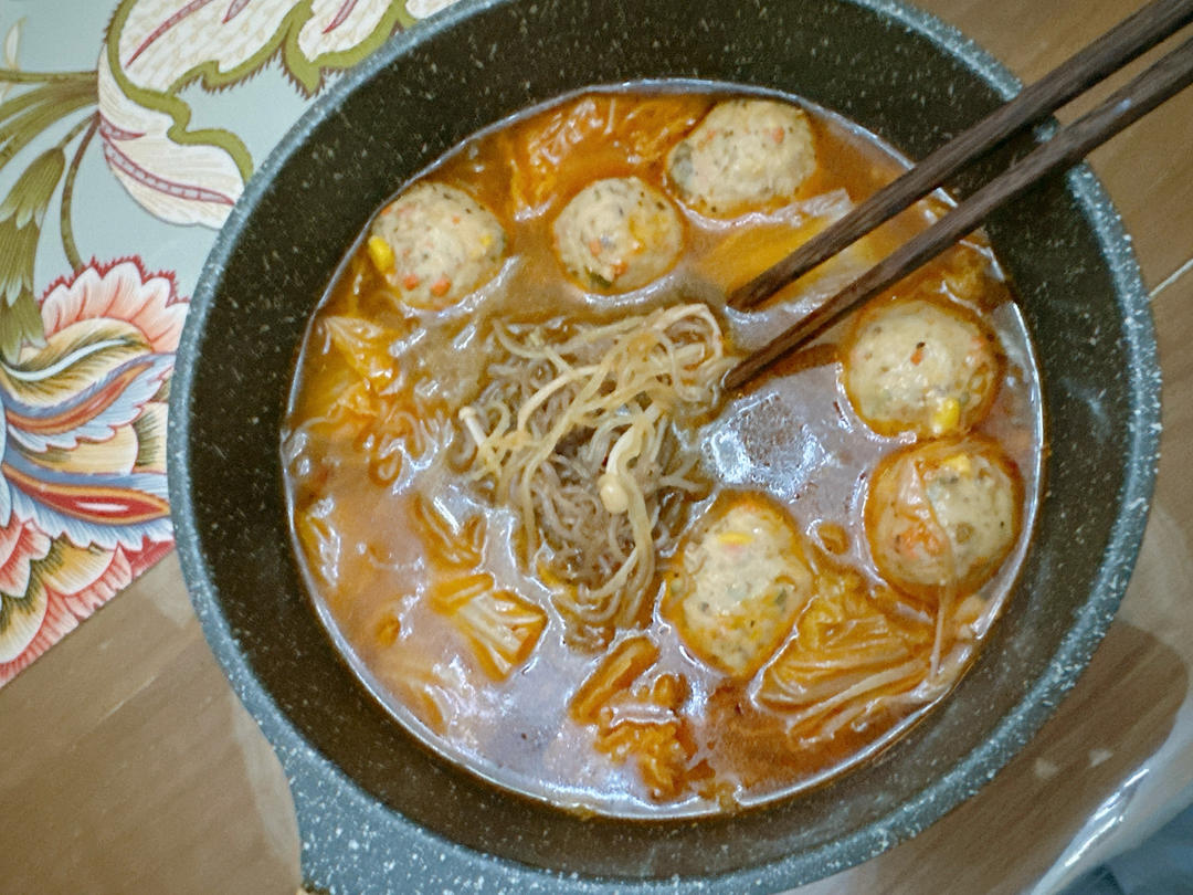 煮魔芋面 加了娃娃菜金针菇鸡肉丸