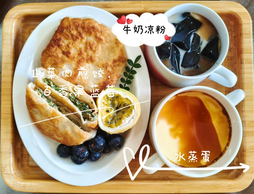 韭菜肉煎饺、百香果&蓝莓、牛奶凉粉、水蒸蛋!