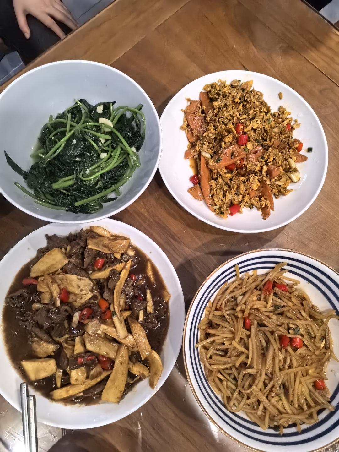 红薯叶,茭白炒牛肉,土豆丝和火腿炒鸡蛋