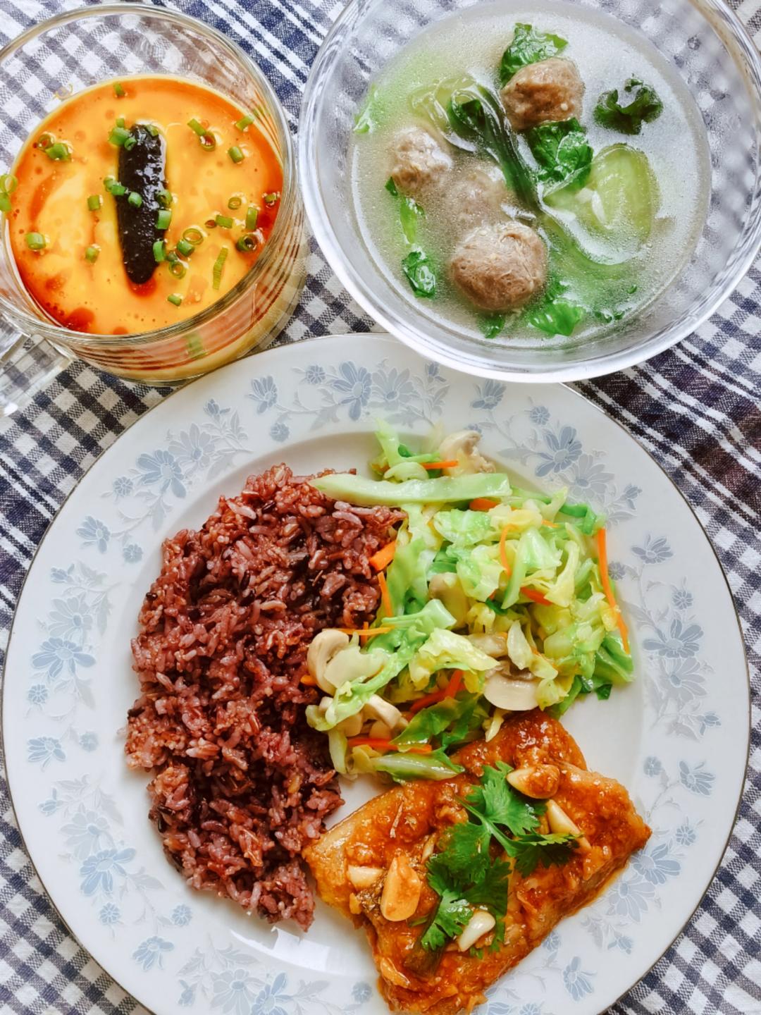 清涵819 做过 2025年09月29日 三年级小学生25.9.28午餐:1、杂粮饭(大米,黑米,红米,小米)2、海参蛋羹3、牛肉丸汤(青萝卜,牛肉丸,粉条,生菜)4、糖醋带鱼5、清炒包菜口蘑 09-29