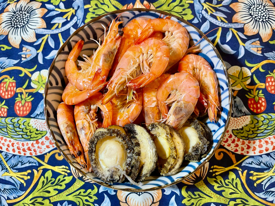 白灼大虾🍤和鲍鱼,清蒸鳜鱼,烧平菇,炒菜心。
