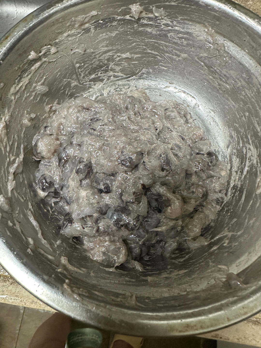 650g虾,去头去皮只剩下240g,黑虎虾的成品率太低了。弄完下蛋清,白胡椒(好像下多了),盐,搅拌了很久才勉强起胶,不知道是否成功。