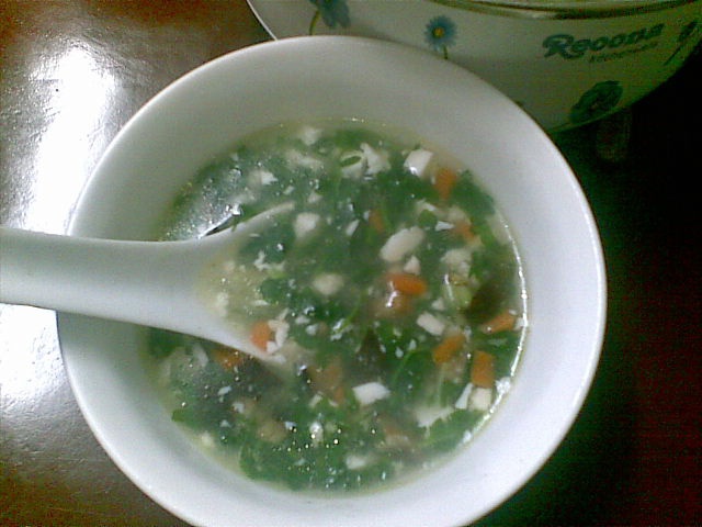 我放了胡萝卜粒,火腿肠粒,香菇粒,这样加上荠菜的青,豆腐的白,颜色好看一点