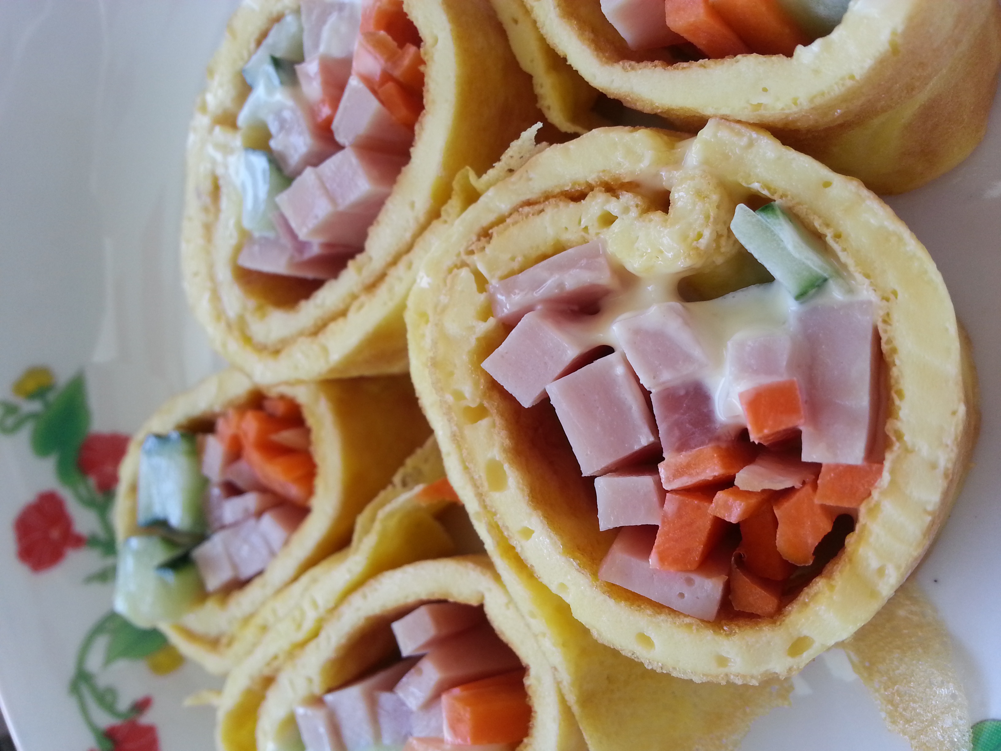 卷的不够紧实呢,但还是能凑合啦~肉松换了火腿,另外加了甜辣酱,好好吃噢~
