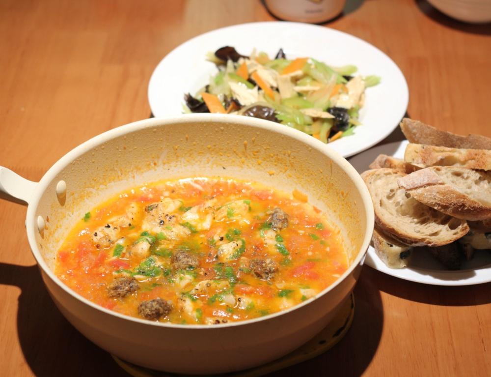 番茄鳕鱼汤蘸法棍,额外加了几个肉丸子