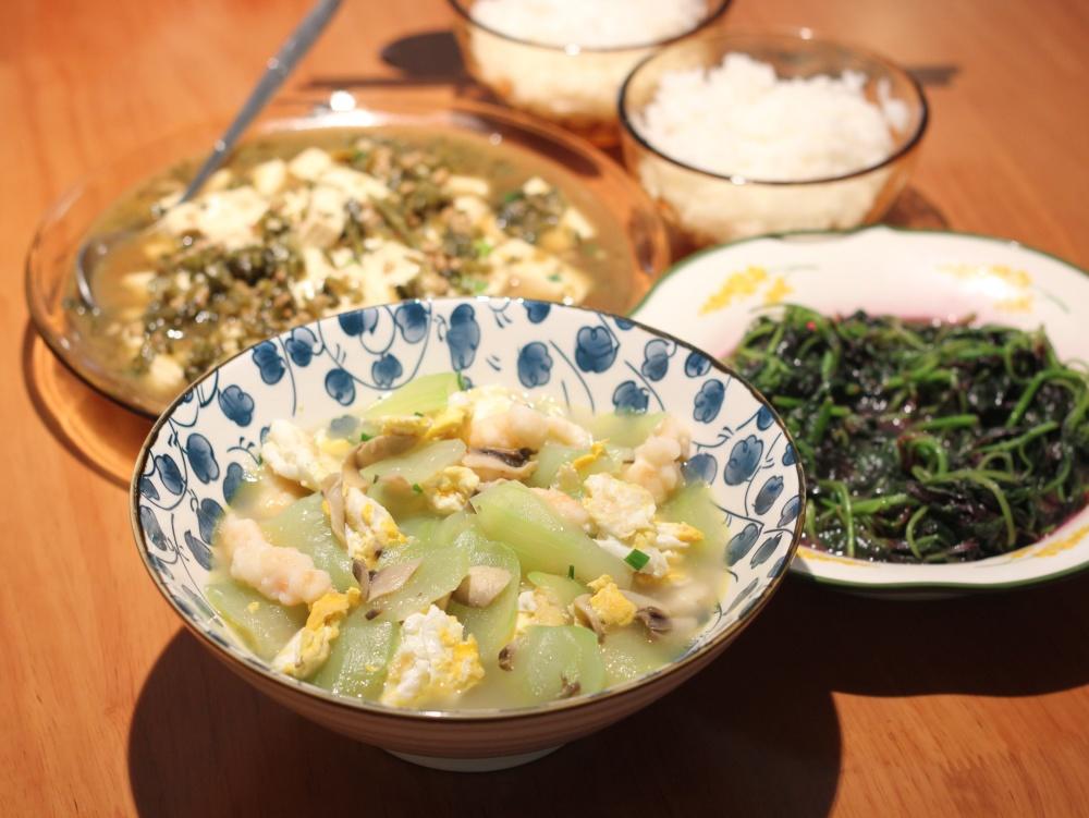 扫冰箱的虾滑瓠瓜汤、皮蛋豆腐、炒苋菜