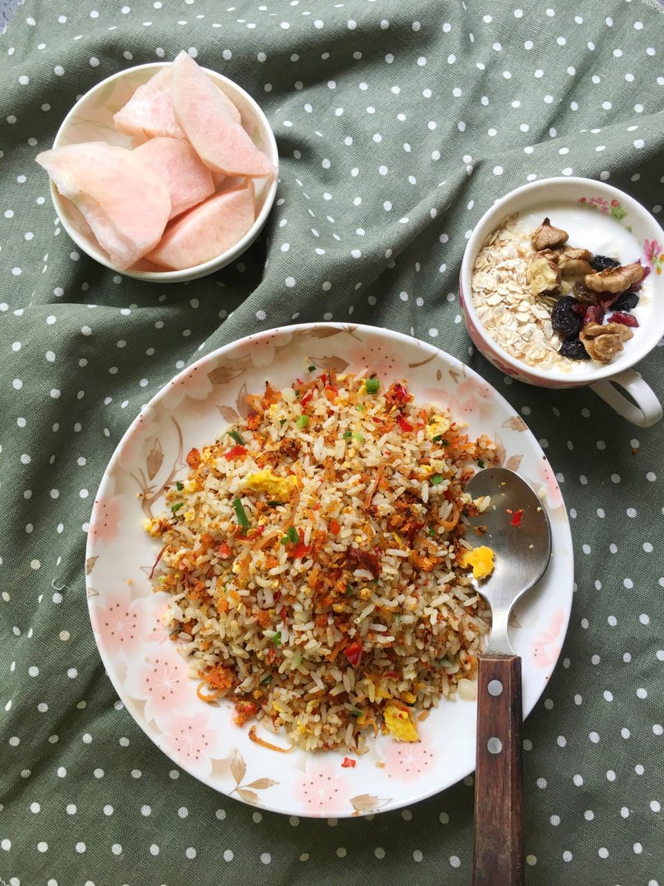 早餐:最爱鲊广椒土鸡蛋炒饭,坚果自制酸奶,桃