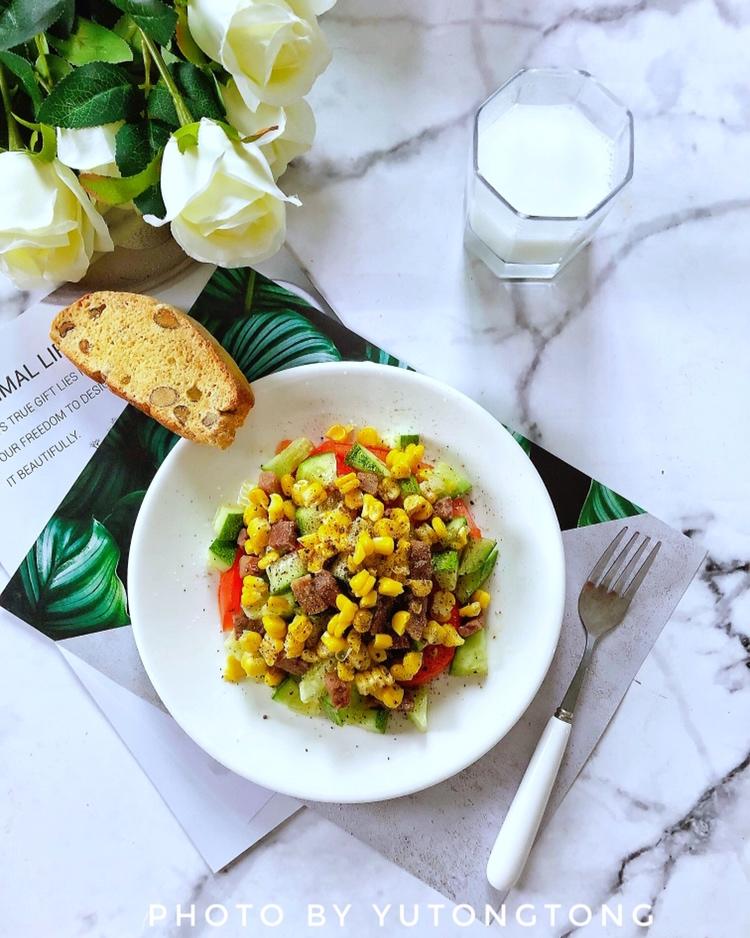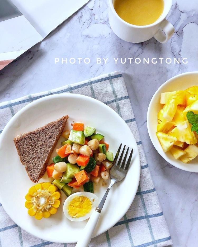 今日早餐:全麦吐司、水果玉米、水煮蛋、沙拉、凤梨、番...