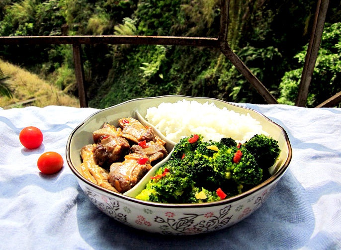 今日简易午餐:腐竹烧排骨+蒜蓉西兰花 ~~嗯,一个人也要好好吃饭~~