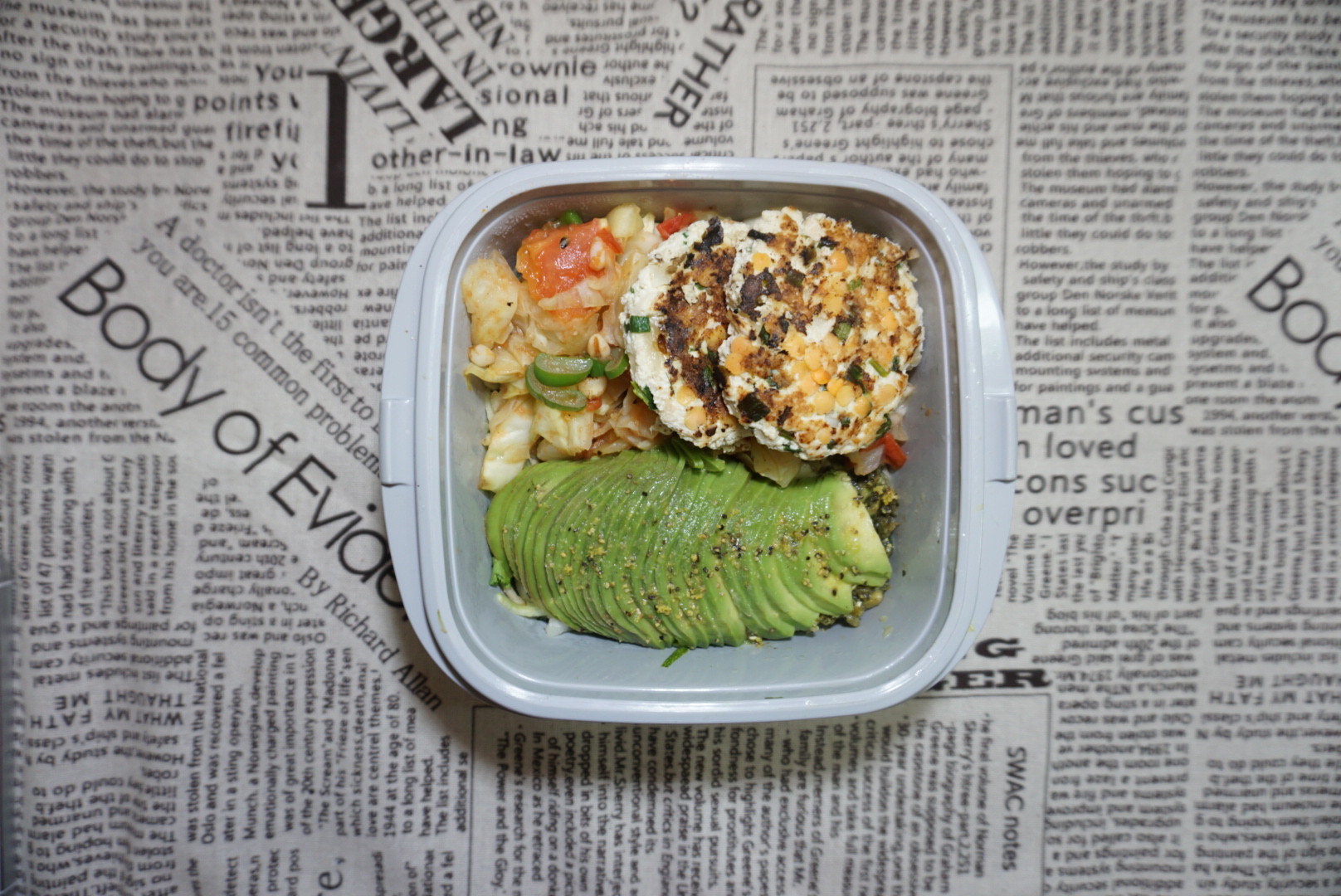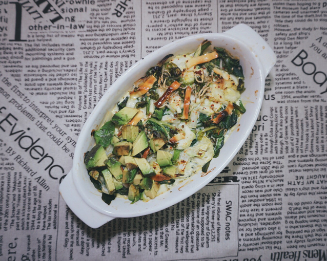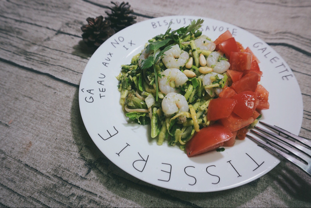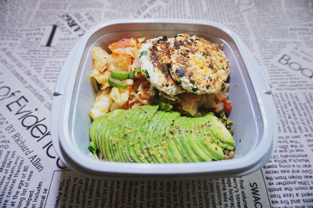 自制青酱Zoodles+三文鱼韭菜豆腐饼+西红柿炒洋白菜+牛油果