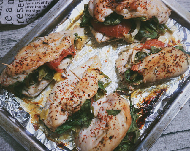 咖喱时蔬炒黑米饭+菠菜奶酪酿馅烤鸡胸
