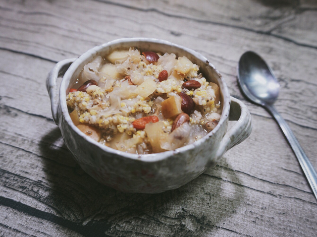焖了一杯红,红枣银耳枸杞小米红芸豆薏米花生苹果,早上来这么一碗热汤好舒服。