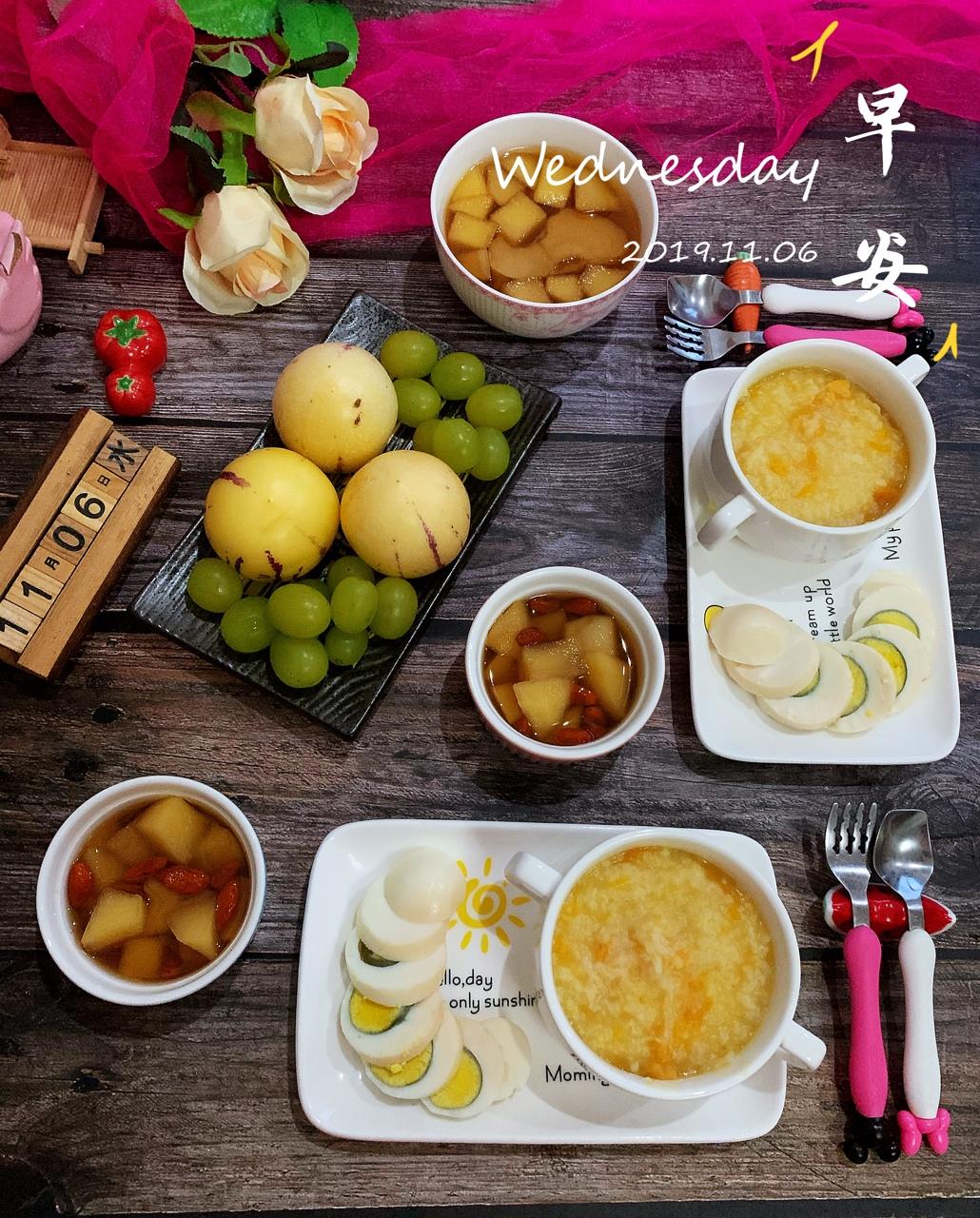 今天是两个娃儿的早餐,红薯粥,蒸一碗苹果枸杞汤和鸡蛋,一锅解决的早餐果然速度快