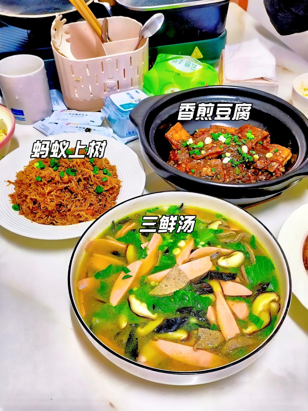 社区上门做菜|花28块钱做三个菜:香煎豆腐、三鲜汤、蚂蚁上树,你觉得怎么样?