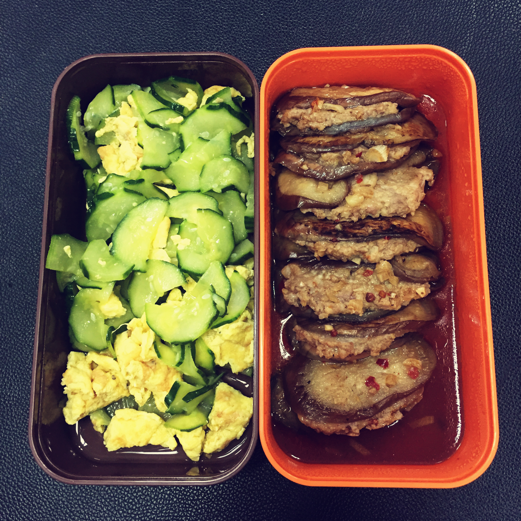 最近都自己带便当…昨天做的是酿茄子和青瓜炒蛋…酿茄子自己剁肉调味酿…很开心很满足❤️