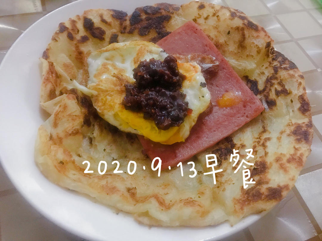 #早餐•2020年9月13日# 手抓饼,午餐肉,土鸡蛋,香菇酱的组合。