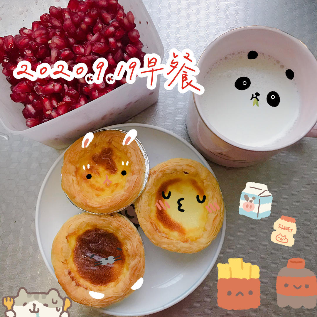 #早餐•2020年9月19日# 买了蛋挞皮,做的全蛋版的蛋挞液,热了牛奶,打包带走,石榴是老母亲自己吃的。