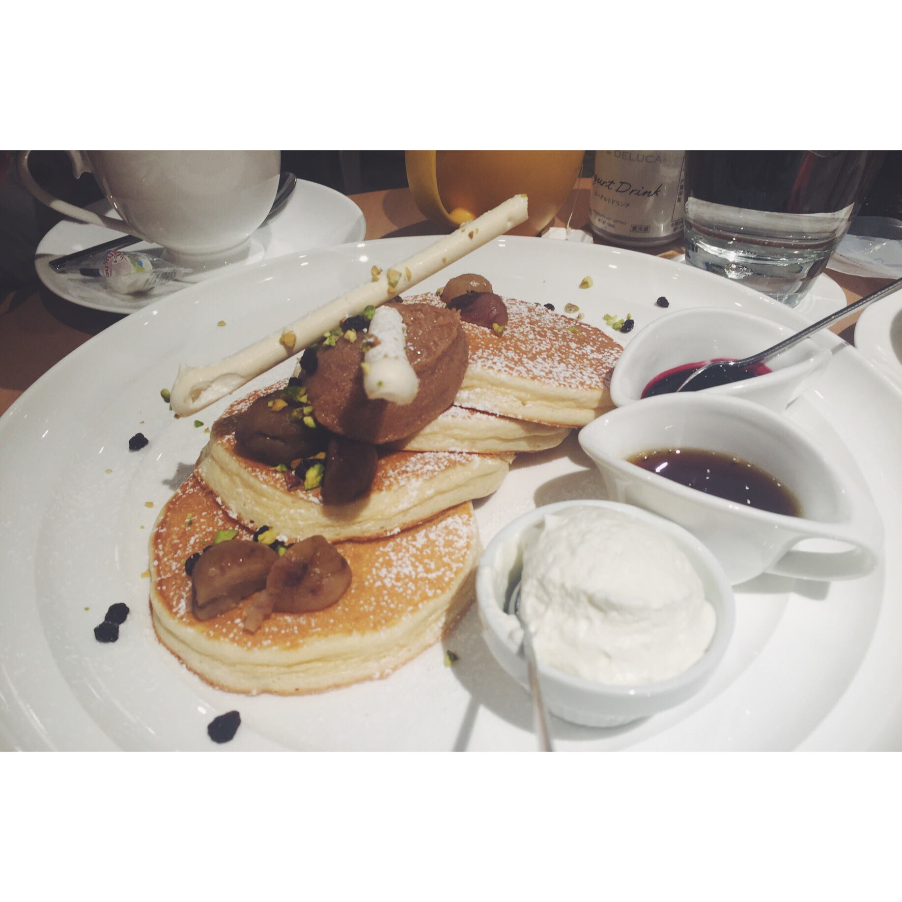 双层舒芙蕾pancake+枫糖浆+黄油+鲜奶油