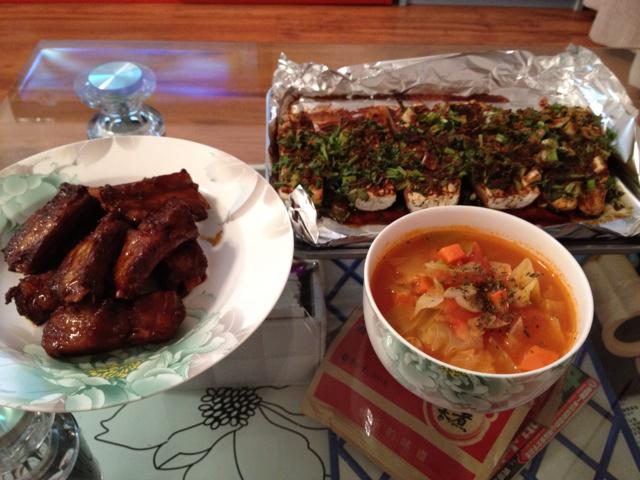 糖醋排骨,烤茄子,罗宋汤,哈哈,好丰盛!