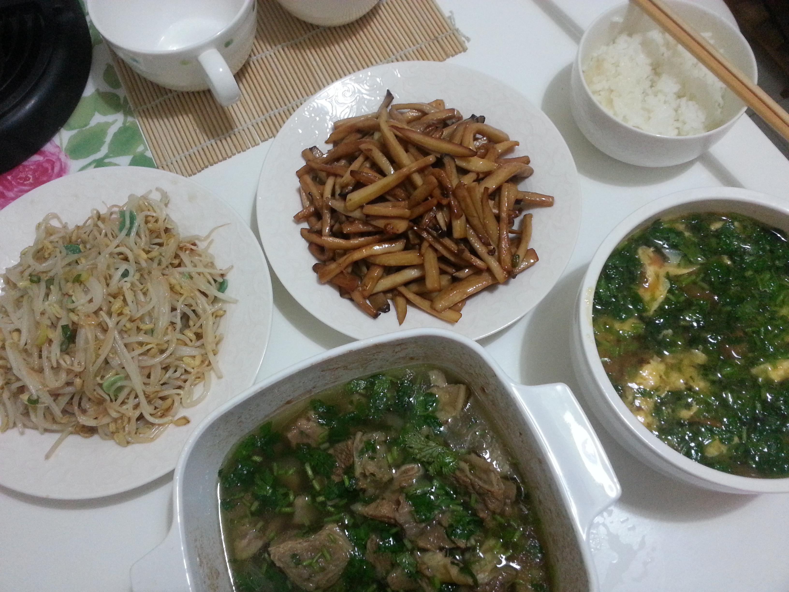 清炖牛肉,干煸杏鲍菇,绿豆芽