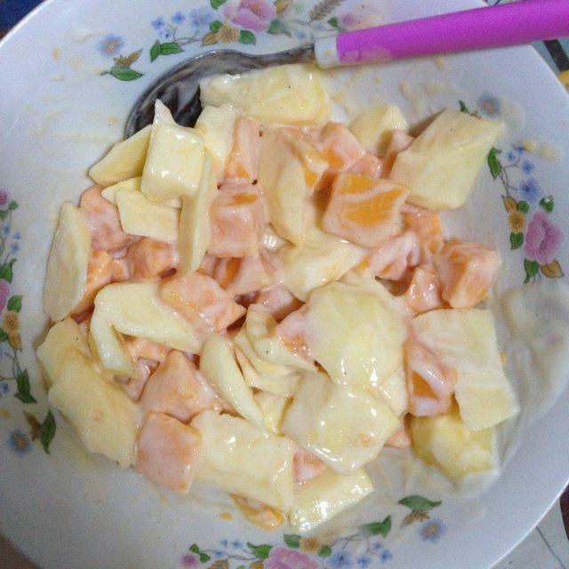 木瓜苹果水果酸奶色拉,味道不错哟〜